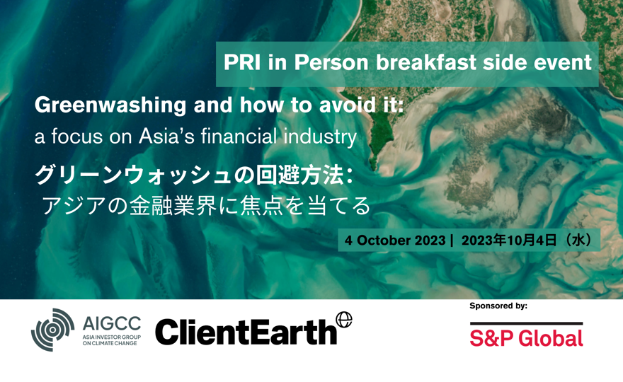 気候変動に関するアジア投資家グループ(AIGCC)とClientEarthは、2023年10月4日に東京で開催されるPRI(責任投資原則)年次総会中に、サイドイベントを開催します。このイベントでは、法律の専門家、投資家、規制当局からなる登壇者が集まり、ブランドのグリーンウォッシュから金融商品やファンドの不当表示まで、グリーンウォッシュの様々な側面と、規制当局による取り締まりや訴訟など、そのような行為がもたらす結果について議論します。また、グリーンウォッシュのリスクを回避するために、金融関係者がどのような行動を取るべきかについても議論します。