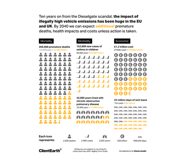 Ten years on from the original Dieselgate scandal, there are still millions of excessively polluting diesel vehicles on our roads. We and our NGO partners sent legal complaints to the UK and French governments in 2023 for failing to tackle the issue. They have now launched investigations but action is not happening fast enough and these cars are still polluting our roads and harming our health. A new report now exposes the staggering human and economic costs inflicted on the EU and UK, which will continue to mount unless action is taken. Governments need to hold these car companies to account once and for all to deliver the solutions needed to protect people’s health.